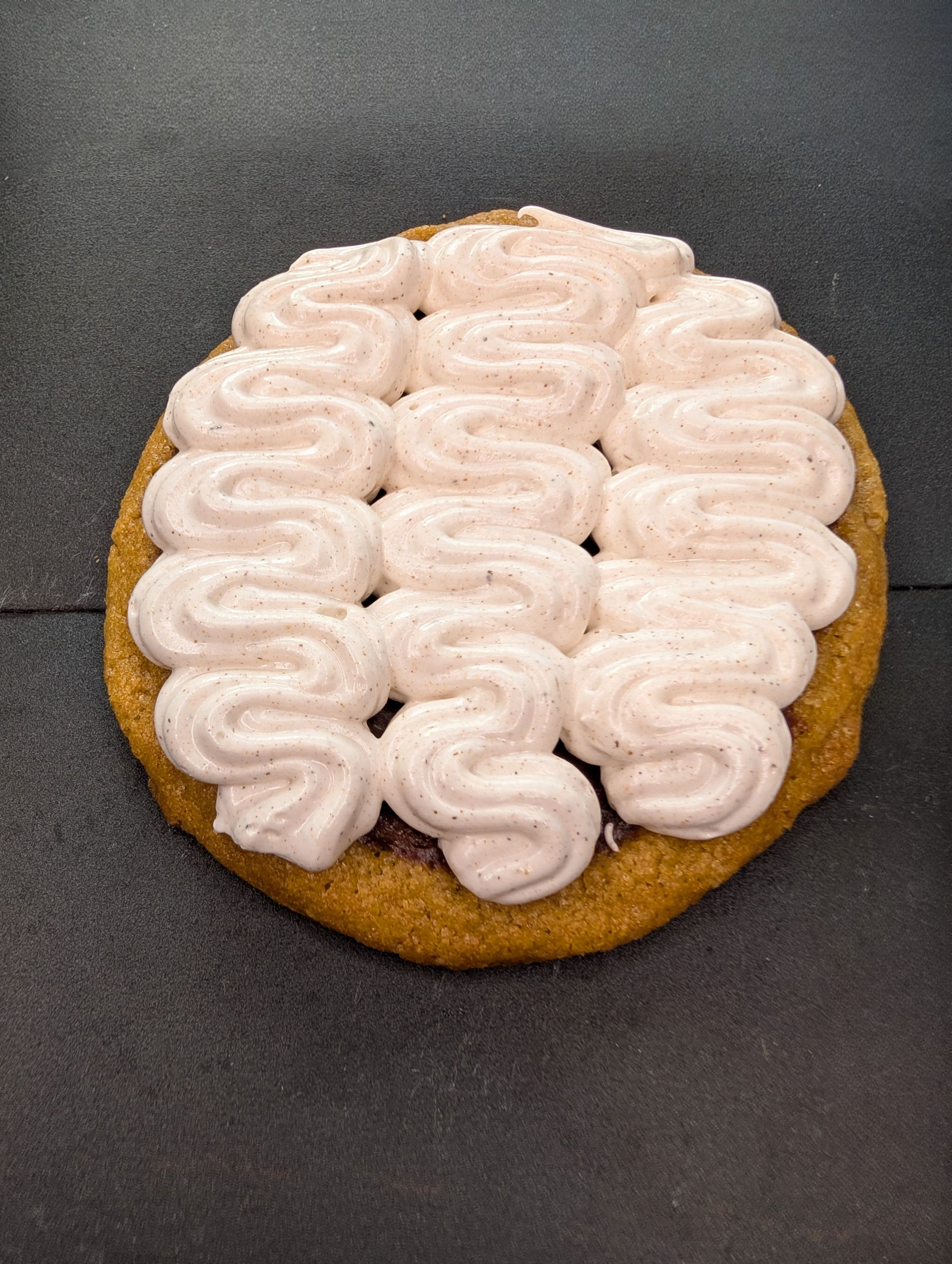 Meet your new cuddle-cookie! A super-soft base topped with silky Valrhona dark chocolate ganache, brightened by pops of poached yuzu. Finished with a delicate swirl of guf (marshmallow topping) infused with classic Christmas spices: cinnamon, ginger, nutmeg, and clove; For a warm, aromatic finish. Every bite balances deep cacao, zesty citrus, and cozy spice.