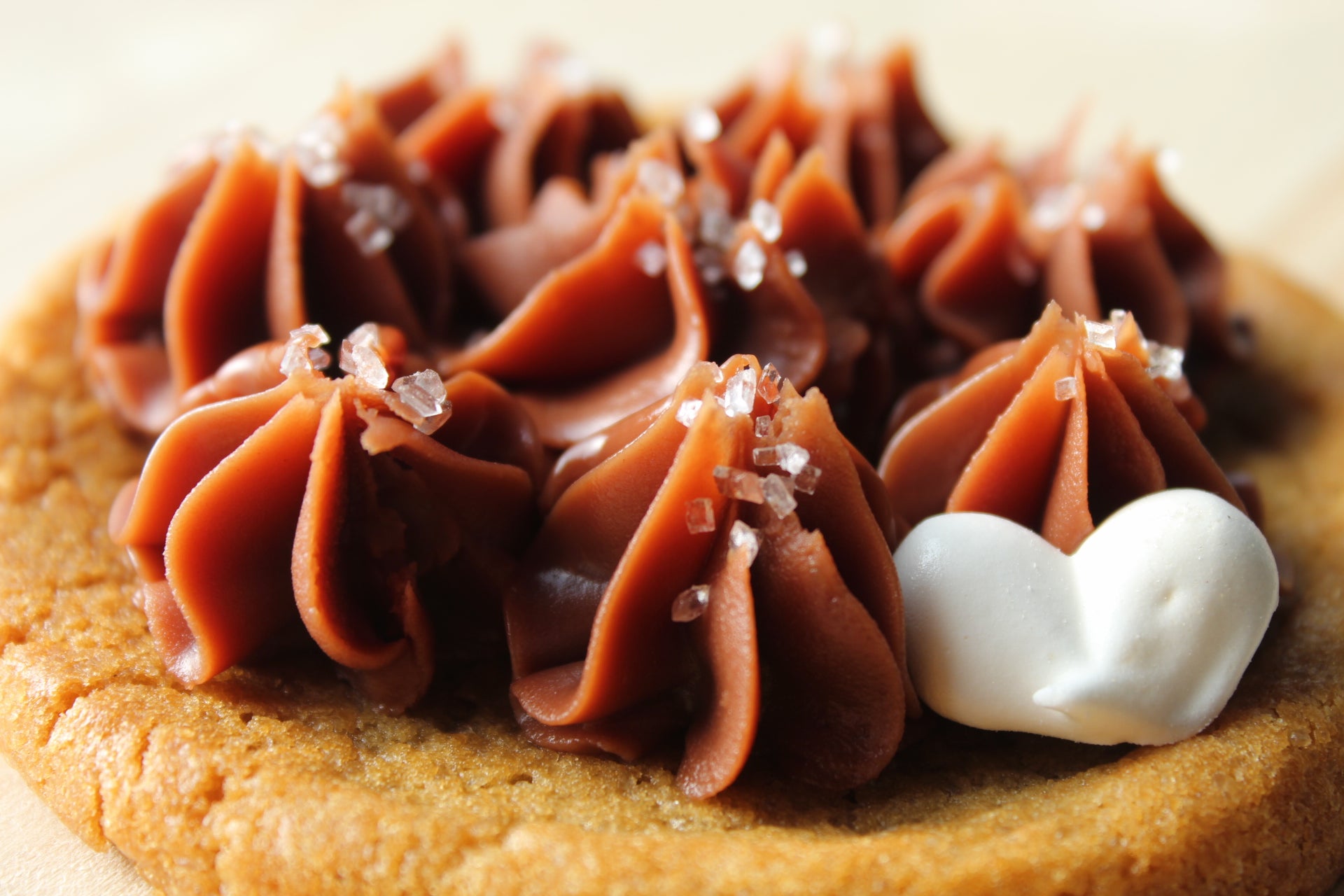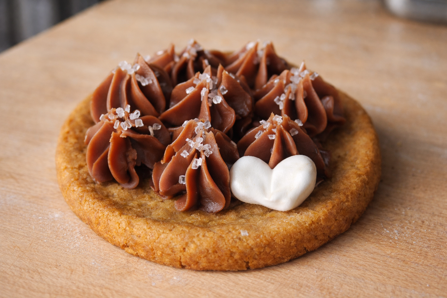A soft, buttery cookie crowned with a silky Valrhona Jivara milk‑chocolate ganache, delicately blended with golden Danish honey for a smooth caramelized depth and comforting sweetness. Finished with pearled sugar for a gentle crunch that highlights the rich chocolate notes.